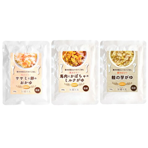 愛犬の安心レトルトごはん 低カロリー3つの味セット 100g×3袋 (ササミと玉子のおかゆ、馬肉とかぼちゃのミルクがゆ、鮭の芋がゆ各1袋) 犬 無添加 国産 低脂肪 低カロリー 乳酸菌入り お試し おかゆセット 低カロリー